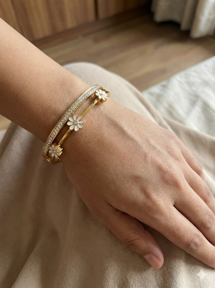 Designed with a delicate flower motif and embedded crystals, this bangle blends minimal luxury with everyday comfort.