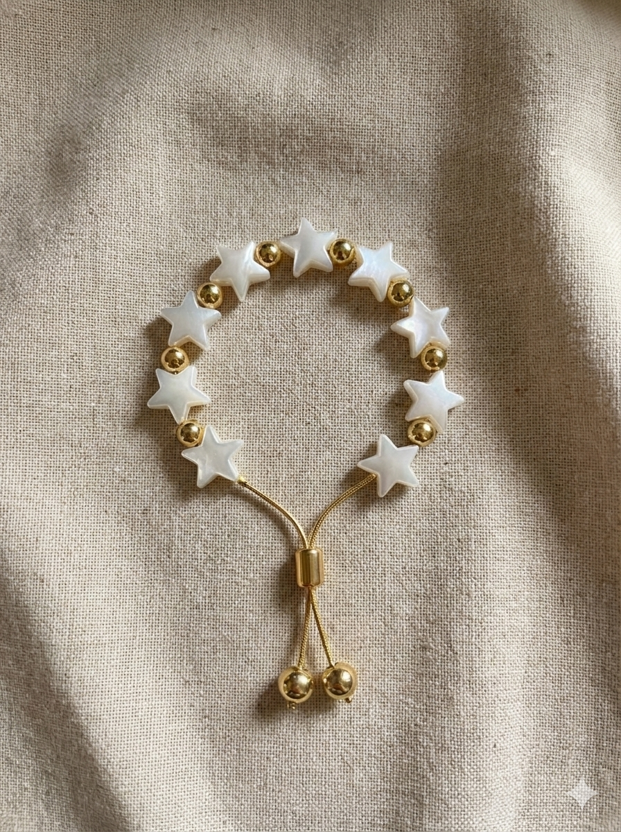 This adjustable bracelet features glossy white star beads paired with polished gold-tone accents. Designed for comfort and versatility, the sliding clasp allows a perfect fit every time. Minimal yet eye-catching, it’s ideal for casual wear, gifting, or stacking with other bracelets.