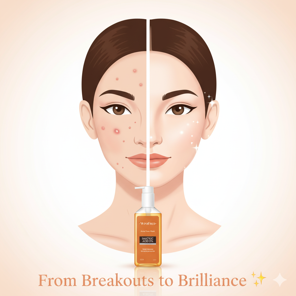 WinyFred 2% Salicylic Acid Face Wash for acne-prone skin. Deep cleanses pores, controls oil, and prevents pimples. Dermat-approved gentle daily cleanser.